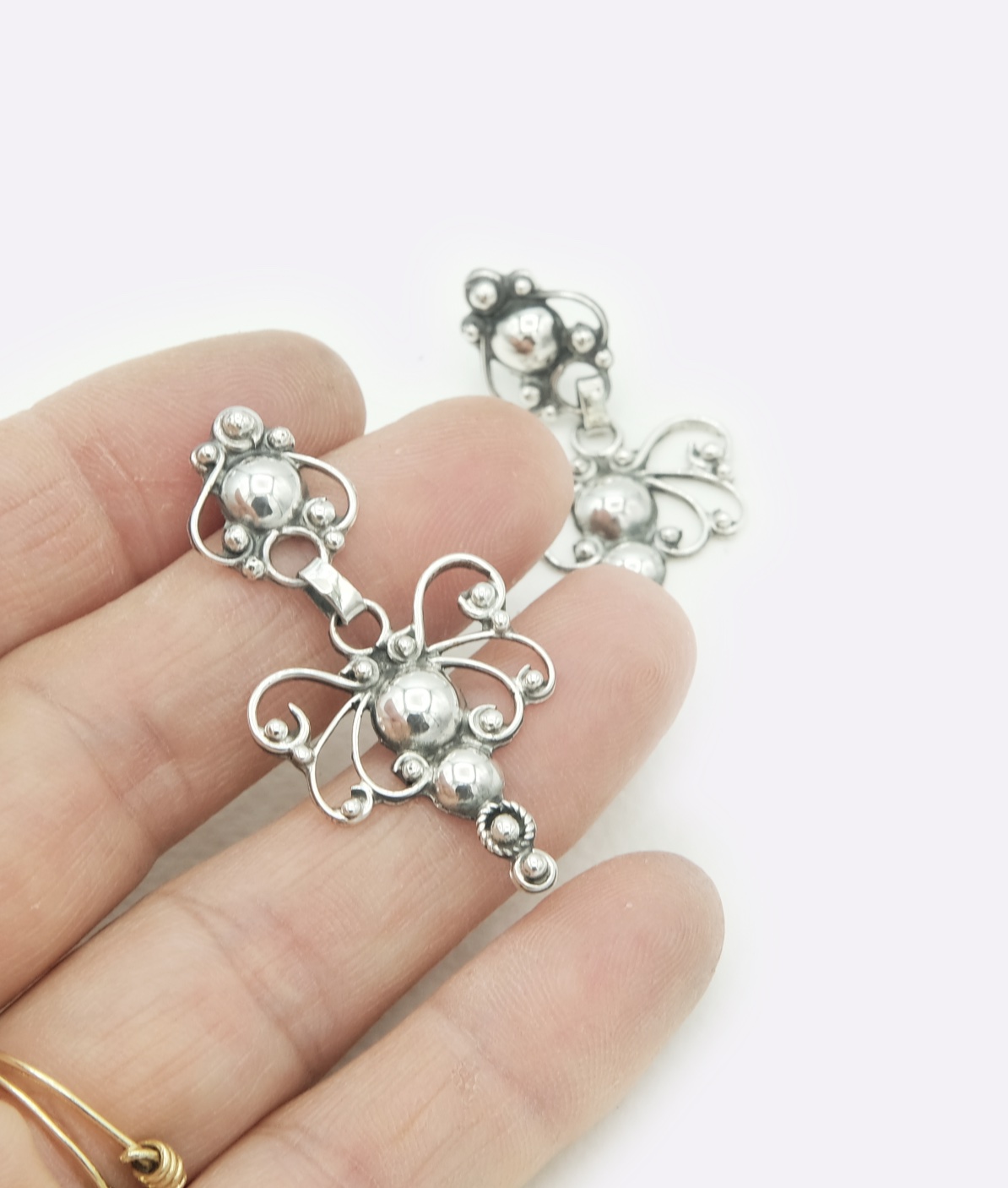 están formados con una lámina fina de plata sobre la que se compone la filigrana. Lamina parcialmente calada para conseguir ligereza, comodidad y luz. Unos pendientes cómodos para lucir todos los días.