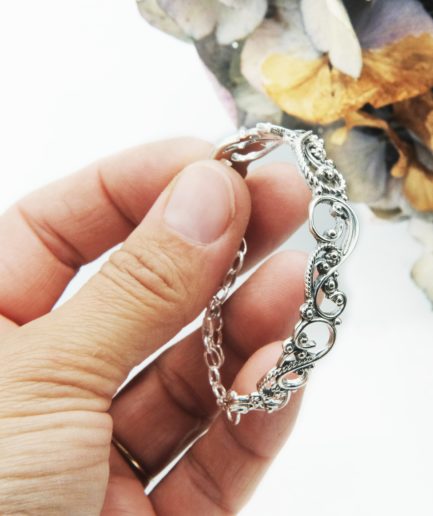 Es una pieza elaborada con mucho mimo, donde cada filigrana y cada bola, son elaboradas manualmente. Una auténtica joya de autor pensada para pasar de mujer a mujer, herencia de luz, vida y fuerza.